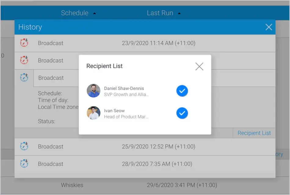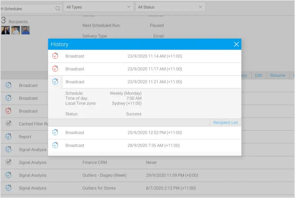 レポートのブロードキャストなどコンテンツ配信のスケジュールタスクが、受信者のリストを保持するようになりました。各履歴の実行では、コンテンツを正常に受信したユーザーと受信しなかったユーザーが追跡されます。また、配信に失敗した場合のエラーを表示することも可能です。