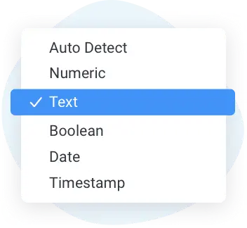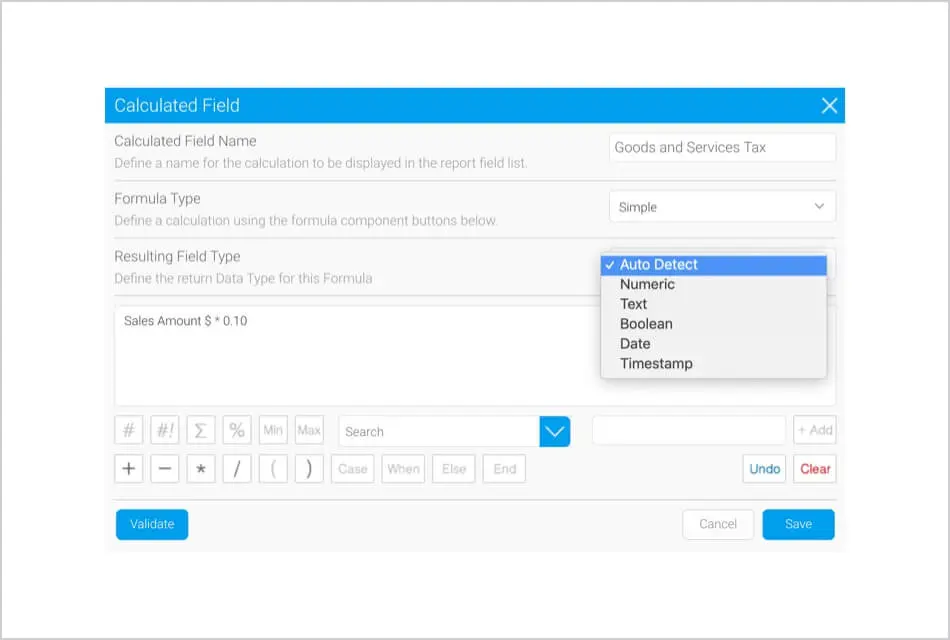 数値、ブール値、テキスト、または日付など、計算されたフィールドの結果の列のデータ型を前もって定義できるようになりました。この機能強化の一環として、エンジンは検証テストを実行しません。自動検出オプションを選択することで、エンジンがデータ型を決定できるようにするオプションもあります。