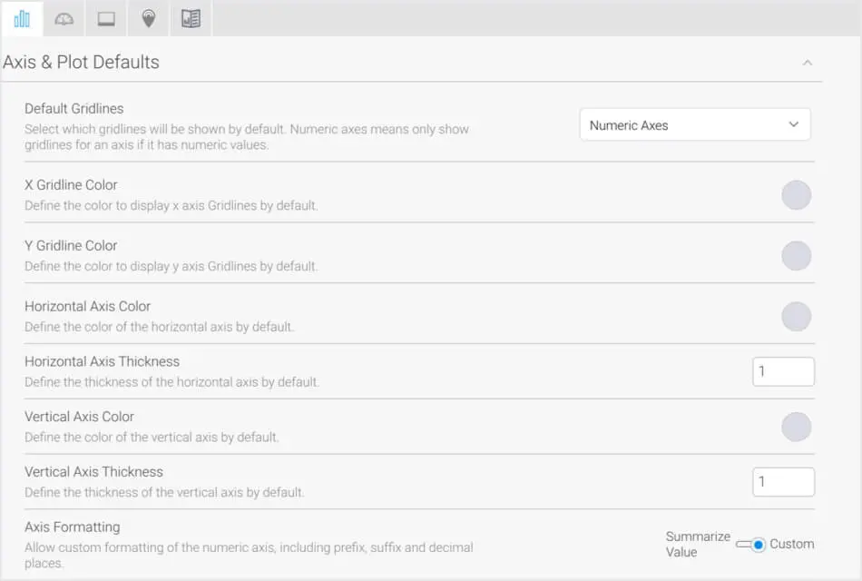 管理者設定レベルでグラフの軸の書式設定を指定できるようになりました。この機能強化の一環として、数値軸の単位が要約されるかどうかを選択したり、カスタムフォーマットを定義することができます。この設定は、ジクの書式設定が 「デフォルト」 に設定されている場合、グラフに適用されます。