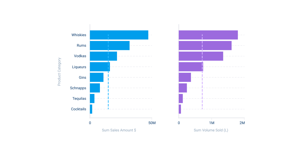 横棒グラフは、一目で複数のグループのデータセットを対比させ、2つの軸の関係を示すのに役立ちます。また、棒グラフの種類によっては、時間に伴うデータの変化も表現できます。