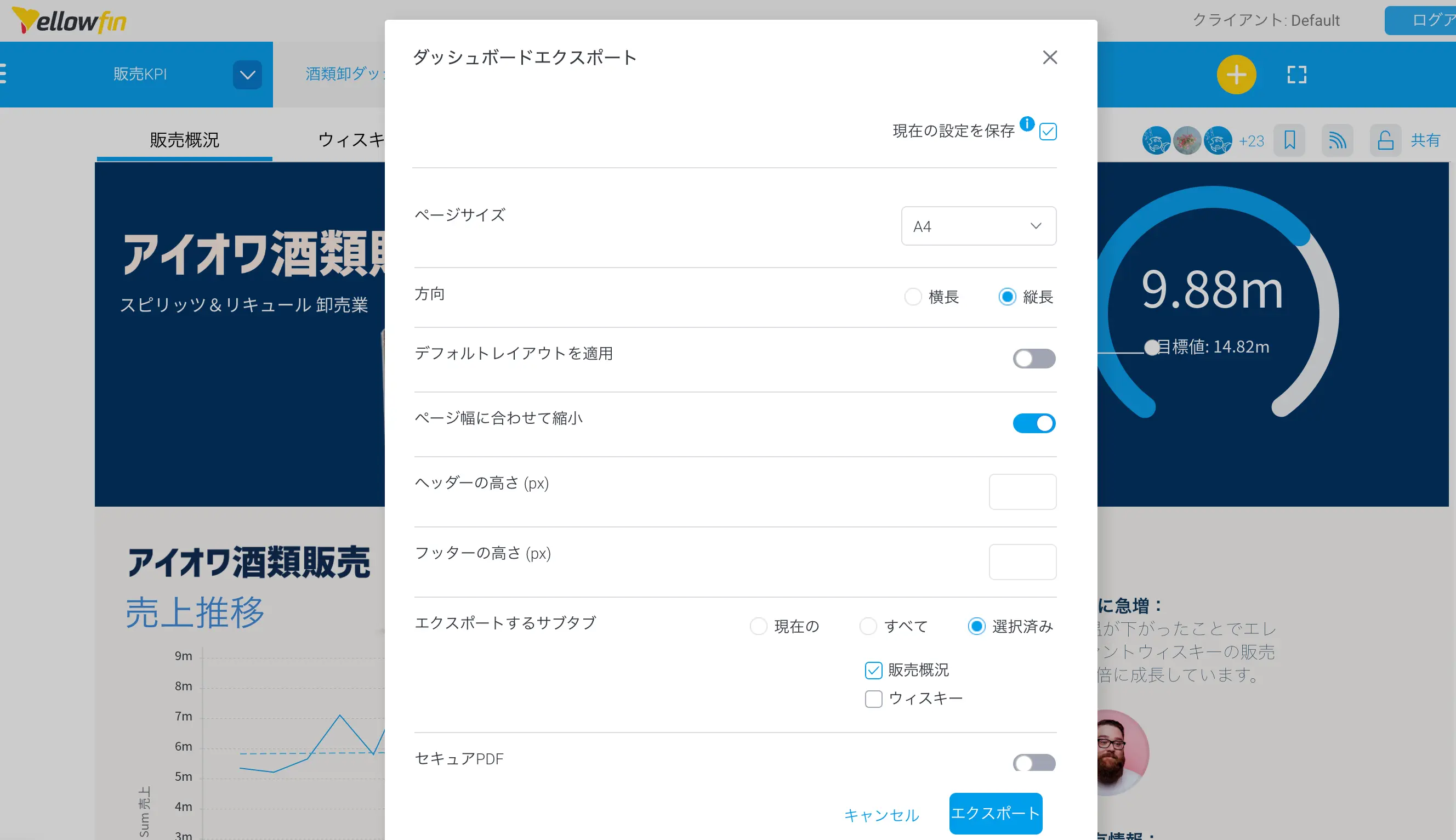 このような場合、エクスポート機能を使用して、Yellowfin ダッシュボードまたはレポートのスナップショットを、PDFなどの多くの一般的なファイル形式にエクスポートし、重要なデータの監視や分析を社内外の主要な関係者に迅速かつ簡単に展開できます。