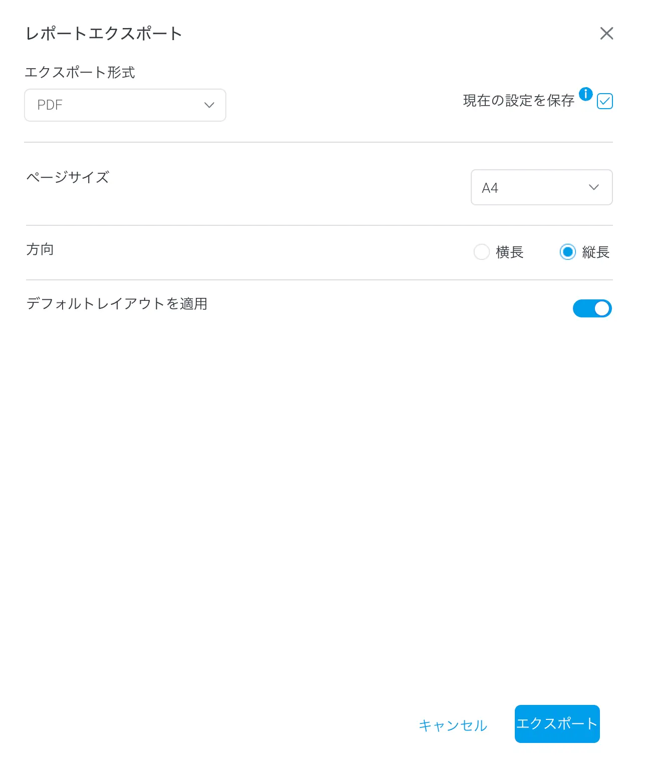 一方、別の例として、PDFへのエクスポートを選択すると、PDFファイル形式に固有のオプションが表示されます。この場合は、ページサイズ、方向、デフォルトレイアウトを適用するかどうかです。