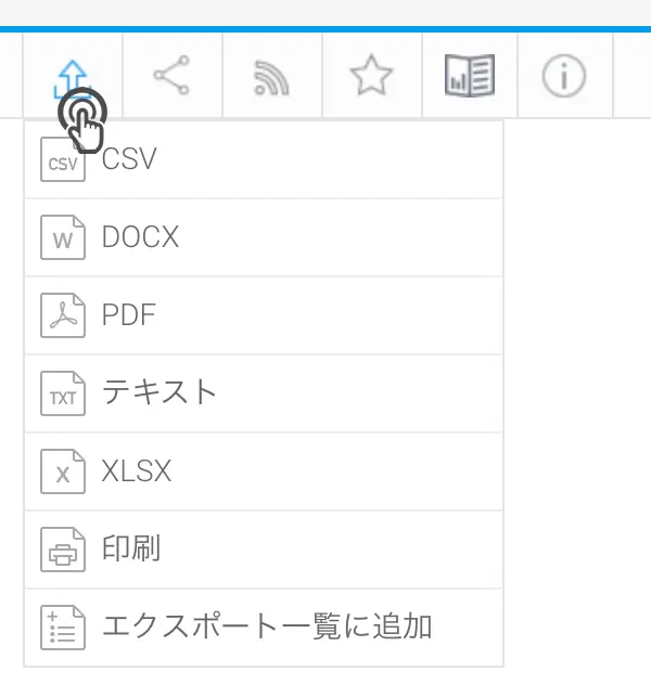 エクスポートボタンは、Yellowfin レポートのメインのツールバーにあるナビゲーションメニューの上部にあります。こちらを開くと、CSV、DOCX、PDF、テキスト、XLSX形式、印刷、エクスポート一覧に追加など、様々なオプションが表示されます。そして、選択したオプションに合わせてダイアログボックスが表示されます。