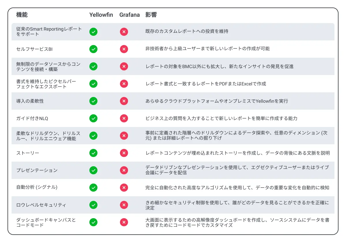 以下の表では、Yellowfin BIと既存のGrafana対応Helixダッシュボードとの機能の違いを簡潔に示しています。これらすべての機能がユーザーに必要となるわけではありませんが、BMCの顧客がHelixソリューションの一部としてYellowfin BIを検討したいと思わせる理由を強調しています。