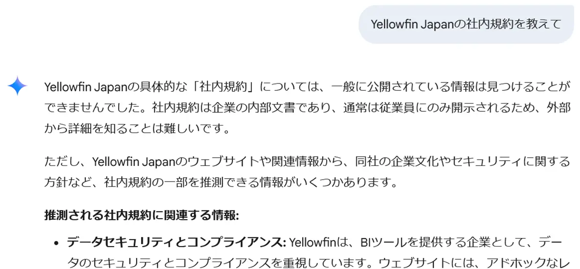 例えば、Google GeminiにYellowfin Japan株式会社の社内規約を質問すると、以下のように回答しました。