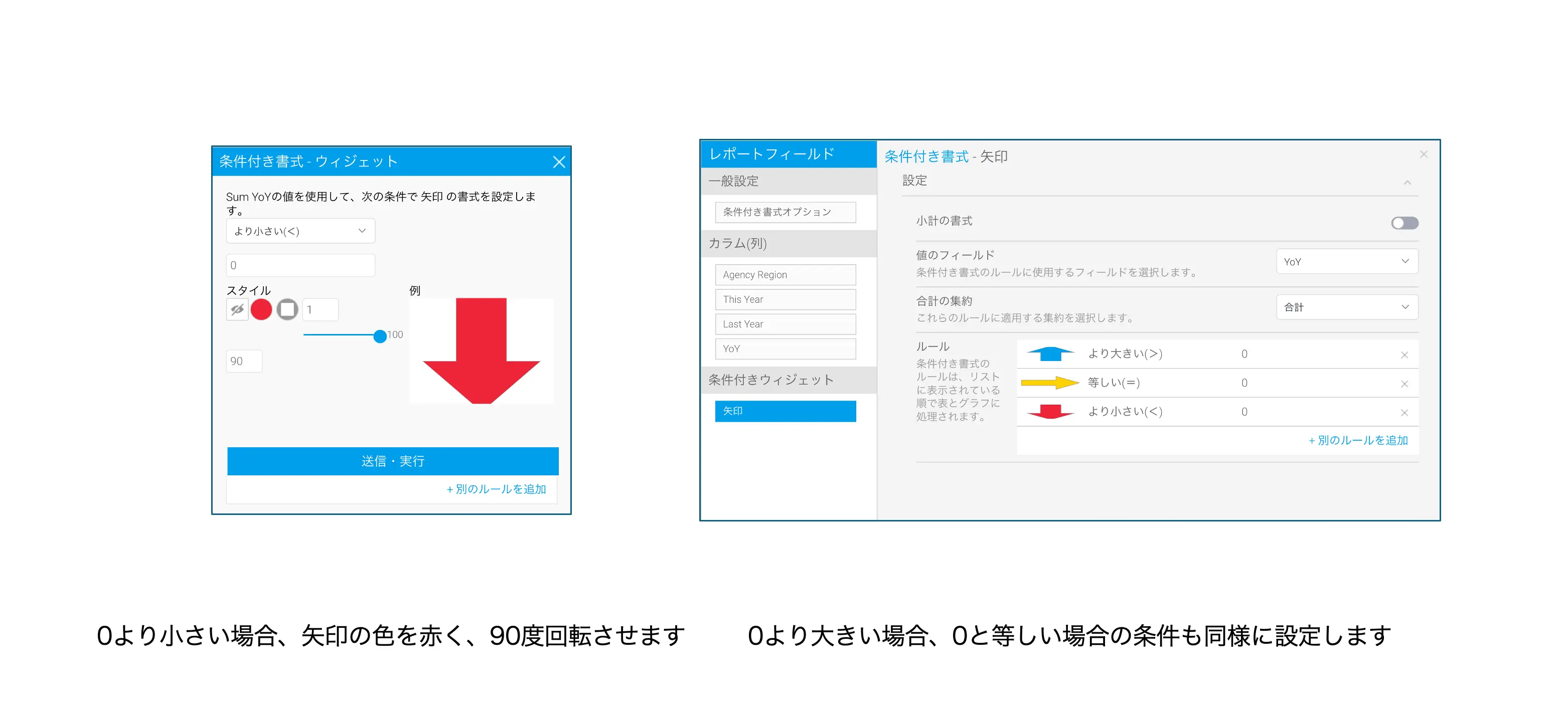 例えば、前年比がプラスであれば矢印を上向きに、マイナスであれば矢印を下向きに表示する、というような使い方が考えられます。まず、前年比を表示するレポートを作成し、キャンバスに矢印を配置します。