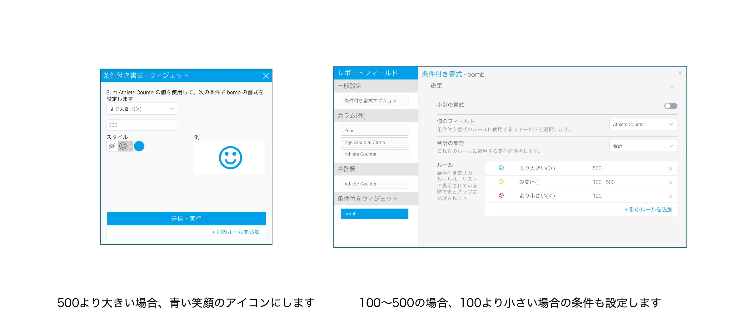 レポートのキャンバスで設定する条件付き書式は、フィールドの集約値を使用して設定するので、表の条件付き書式のように「文字列に特定の文字が含まれる場合に◯◯する」といった条件を設定することはできません。また、配置するオブジェクトによって設定できる内容が異なります。